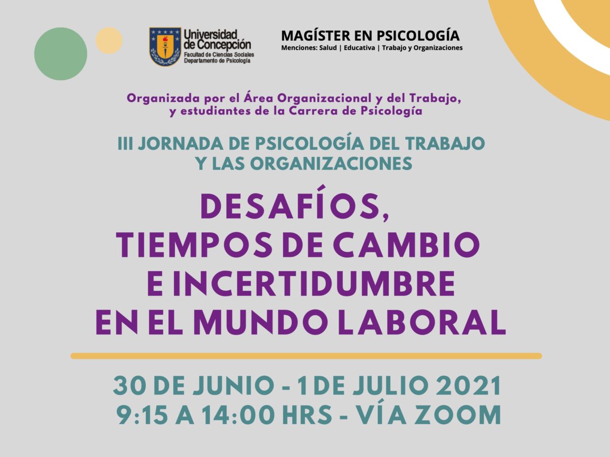 El Área Organizacional y del Trabajo en conjunto con los estudiantes, académicos y egresados/as del Departamento de Psicología de la Universidad de Concepción realizarán la tercera versión de la Jornada de Psicología del Trabajo y las Organizaciones: “Desafíos, tiempos de cambio e incertidumbre en el mundo laboral”.