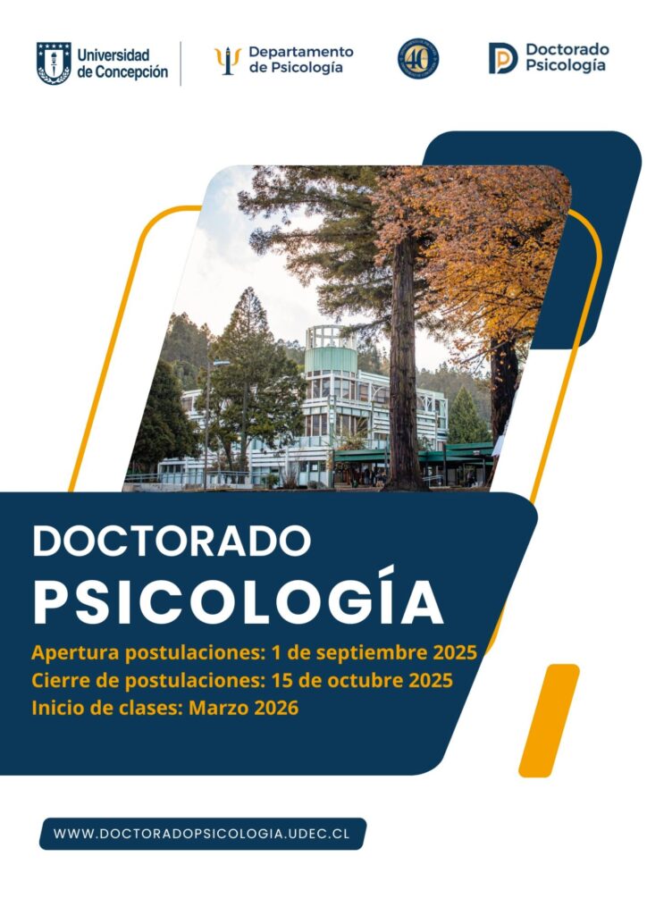 El próximo 1 de septiembre 2025 se da inicio al periodo de postulaciones de una nueva edición del Programa de Doctorado en Psicología de la Universidad de Concepción. El programa busca fortalecer las oportunidades de formación de investigadores/as de Chile y Latinoamérica en el ámbito de la Psicología, potenciando la generación de nuevo conocimiento para contribuir al análisis y solución de problemas sociales.